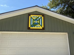 #22-16, Sunflower quilt block is located at 3937 Hwy 43, Harrison. It was created by Susan Stills. Directions: From Brandon Burlsworth Youth Center in Harrison, drive 0.8 mile and drive straight onto AR-43 S/Wilson Avenue. Continue on AR-43 for 2.9 miles. 3937 AR-43 S is on the right, you will see a Kozy Korner sign and Sasquatch next to the driveway. The quilt block is located on the peak of the garage. Susan shares: I was inspired to create this quilt block because of my love of quilts. I have always loved sunflowers because they are sunny and bright. When the war broke out between Russia and Ukraine, I knew I had to paint this pattern featuring a sunflower, because of its significance to the Ukrainian people. The sunflower is the national flower of Ukraine. They prominently display them in festive celebrations, as decorations in their apparel, wreaths and headdresses. After the Chernobyl nuclear power plant accident in 1986, they planted sunflowers in that devastated area. Ukrainians view the vibrant flower as a symbol of peace and resilience. I imagine the symbol has never been closer to their hearts in this current time of war. This quilt block hangs here today, in support of them.