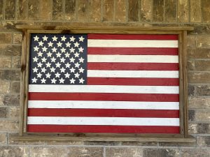 #21-25, The Red, White & Blue, is at 119 Grand St., Ogden AR. Owner Gail Moore shares, “With this quilt block we are wishing our country Happy 250th birthday!” This barn quilt is made of wood pieces and painted red, white, and blue. It is one of two blocks at this location. The two blocks can be viewed from the road when driving by.