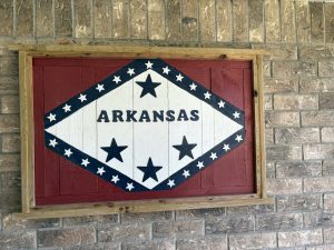 #21-26, Celebrating Arkansas, is at 119 Grand St., Ogden AR. This barn quilt is pieced together from wood and painted the colors and likeness of the Arkansas flag. It’s placed where anyone passing by can see it from the road and enjoy. It’s one of two barn quilts at this location.