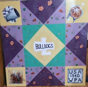 #2-39, Bulldogs or Bust, at 410 Oak Street, Leslie, Arkansas. The painting is by wildlife artist Pamela Kelley. This all-around team spirit quilt trail block is a tribute to the Ozark Heritage Arts Center itself. The building was built in 1938 by the WPA workforce which has great significance. Not only does it document the great need for employment during the lean years of the depression, but also our government’s answer of goodwill to that need. The structure, a charming rock building, has seen several levels of occupation from its construction up to present day. One valuable use being to serve as the gymnasium of the Leslie Bulldogs. With a glimpse of the emblem on the auditorium floor you can imagine the excitement and cheers from the stands filled with family and friends of the basketball players. “Bulldogs or Bust”! Present day, this valued structure houses the Killebrew Theater, an exquisite Heritage Museum, and a most inspiring Art Gallery. “There is gold in them thar hills” – some to be discovered and exchanged for todays currency- but other to be celebrated and cherished. This block is dedicated to Mrs. Rebecca Ashley.
